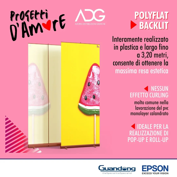 L'amore tra EPSON SC80600 e Polyflat Backlit, multistrato extralarge di Guandong, è così incontenibile che non si può proprio fare a meno di urlarlo al mondo a suon di roll-up e pop-up!